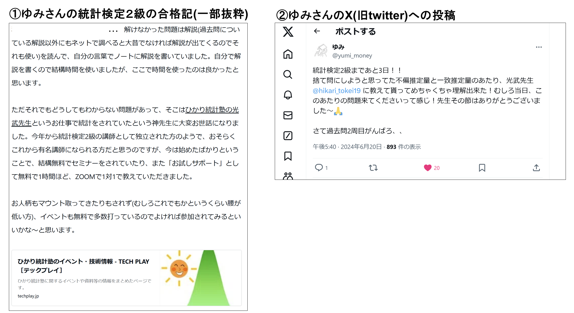 ・ひかり統計塾の講座やイベントをご利用になられた方で、統計検定2級に合格された方の声を、「受講された方の声」に記載しました。
