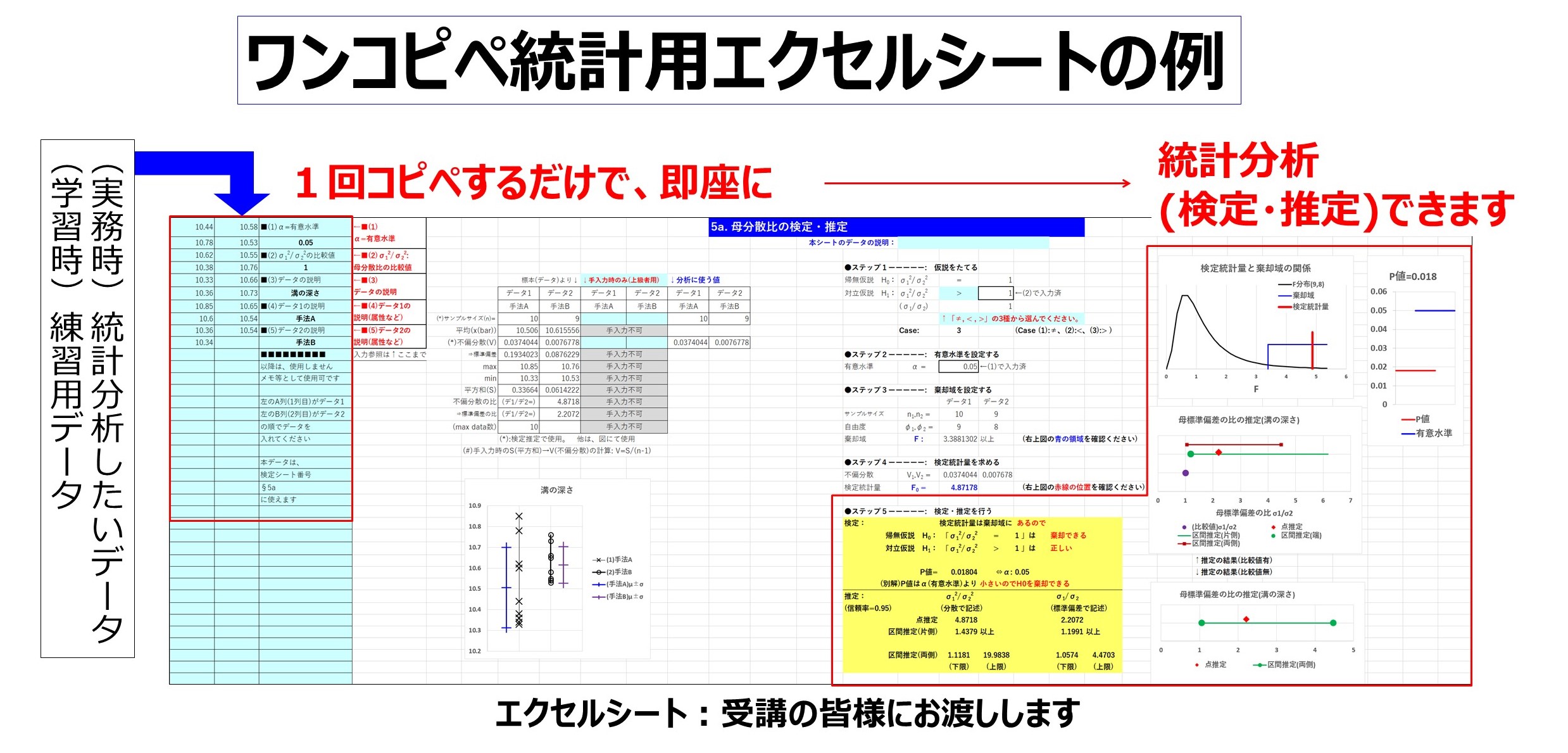 退職を機に、楽しかった統計講師時代を思い出し、「わかりやすい統計講座を皆さんに提供し、データ解析力が求められている世の中で、社会貢献が出来たらいい」、と思いました。 そのような経緯で、私は、ひかり統計塾を立ち上げ、実技コースの構築、ワンコピペシートの提供、統計検定2級コース、上級コースの構築を行い、皆さんに提供できるようになりました。さらに、頻繁に聞かれた質問:「統計や個々の項目をなぜ学ぶのか?」「統計をどう使うのか?」に関して、私なりの答えをコンテンツに含める形で講座を構築しました。これらにより、実際に「わかりやすさ」が増したかどうかは、受講の皆様にご判断をいただきたいと思っております。また、私の企業での講師時代は対面で実施していましたので、録画動画作成やオンライン型講座実施には不慣れですので、その面の不手際などがあるかもしれません。その点は改善していきます。