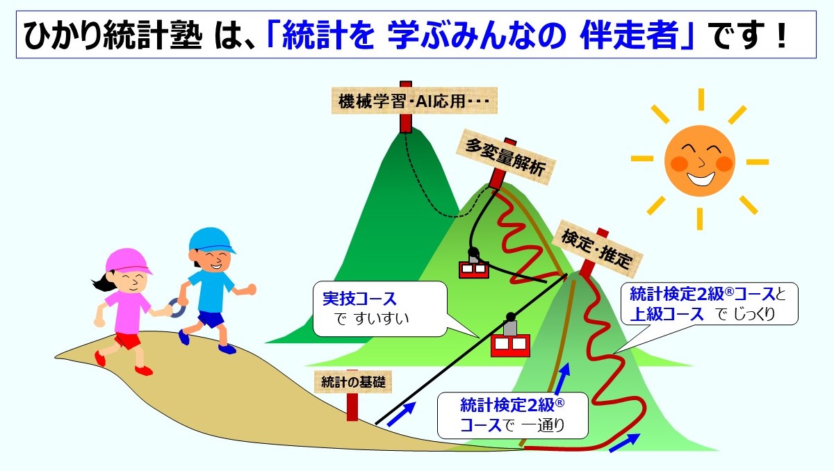 (注)「統計検定®」は、一般財団法人統計質保証推進協会様の登録商標です。ひかり統計塾が提供している講座は非公式講座であり、一般財団法人統計質保証推進協会様によるコンテンツの内容の保証はいただいておりません。